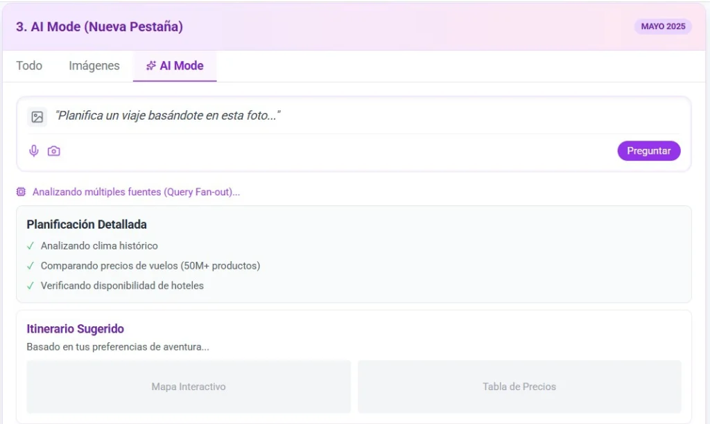 - AI Mode: Requiere datos estructurados profundos (Schema) y optimización de imágenes/video para ser detectado en consultas multimodales.